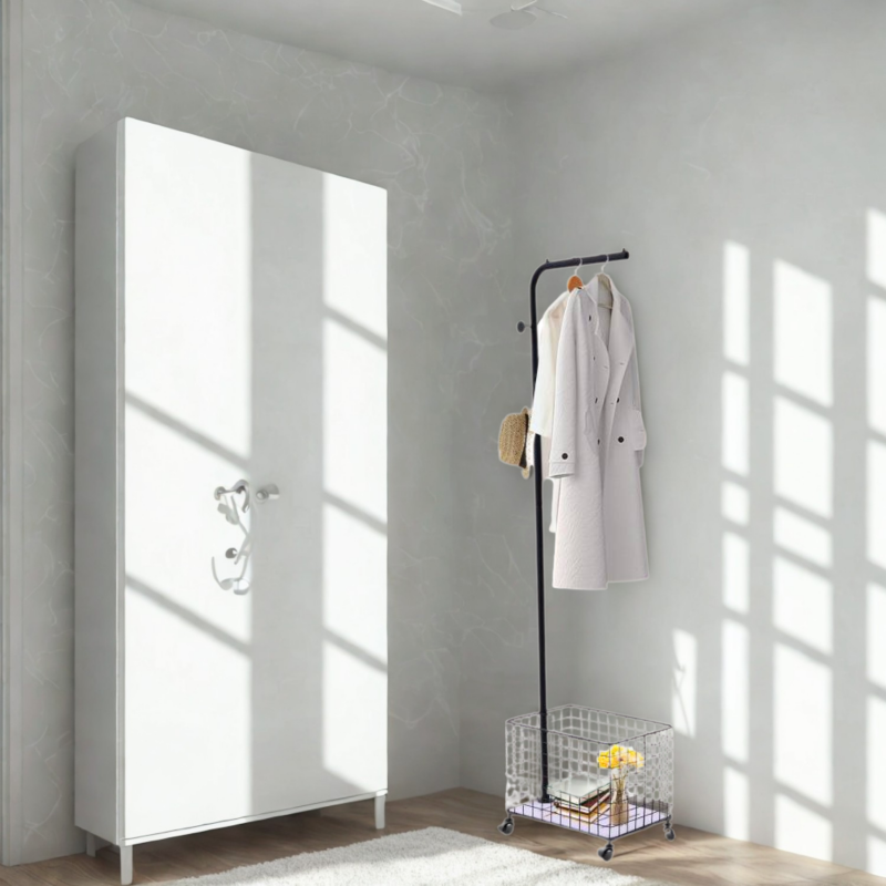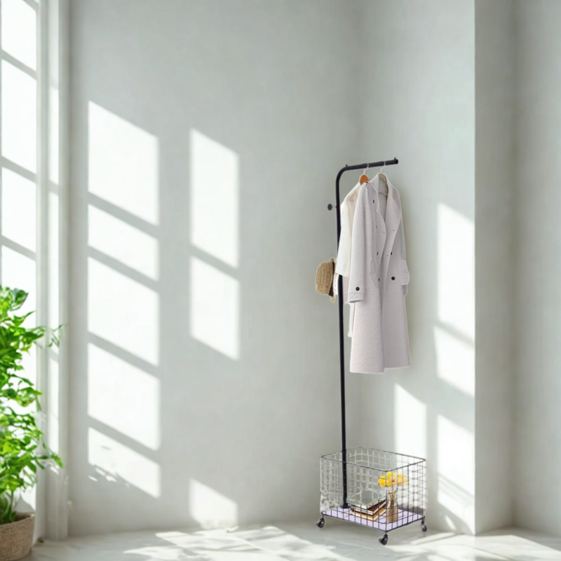 Ce portant à vêtement est solide grâce à sa structure en métal et est très pratique grâce à sa petite tringle pouvant supporter environ 10 cintres, ses 2 crochets et son panier ! Un vrai portant à vêtement 3 en 1.