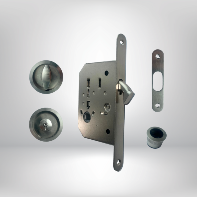Serrure porte coulissante à crochet - Axe 50mm - Rosaces rondes condamnation + tire-doigts + gache