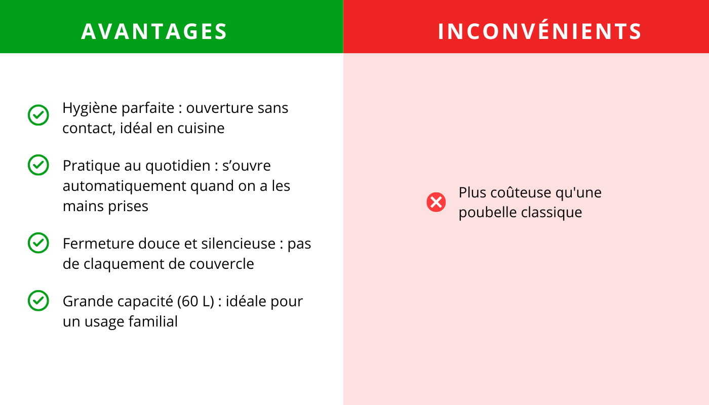 Pas besoin de toucher le couvercle : vos mains restent propres, ce qui est idéal lorsque vous cuisinez ou jetez des déchets alimentaires.