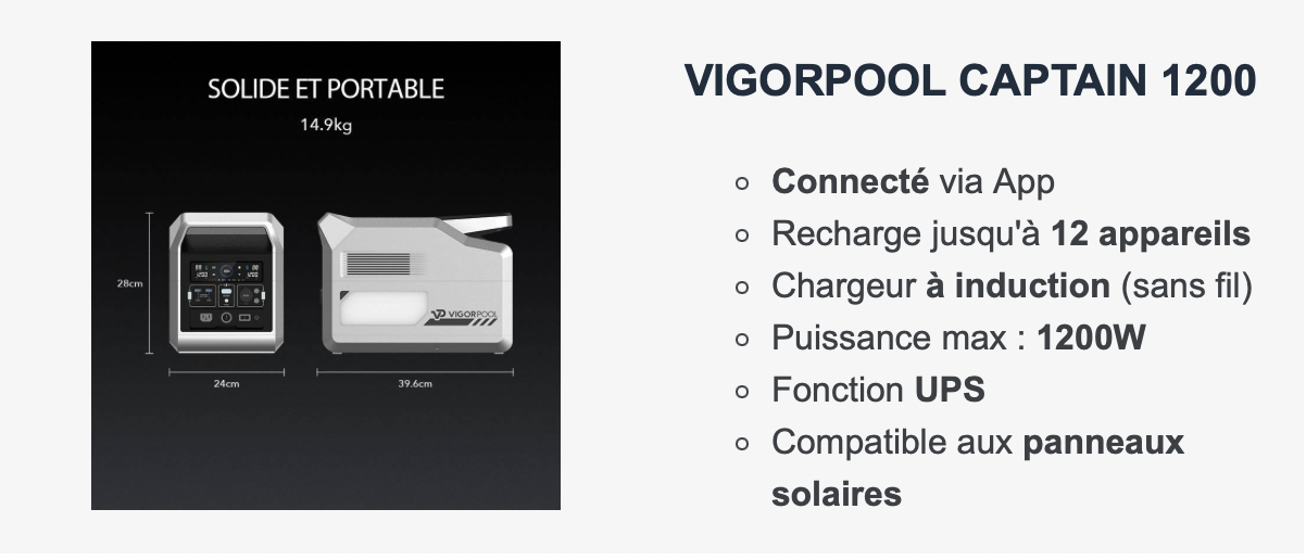 Vigorpool Captain 1200 est bien plus qu'un simple système de recharge électrique et solaire. C'est une solution complète pour alimenter tous vos appareils connectés et électroménagers où que vous soyez. En adoptant cette batterie innovante, vous faites un pas important vers un mode de vie durable. Ne laissez pas vos appareils s'éteindre, donnez-leur la puissance de Vigorpool Captain 1200 dès maintenant.