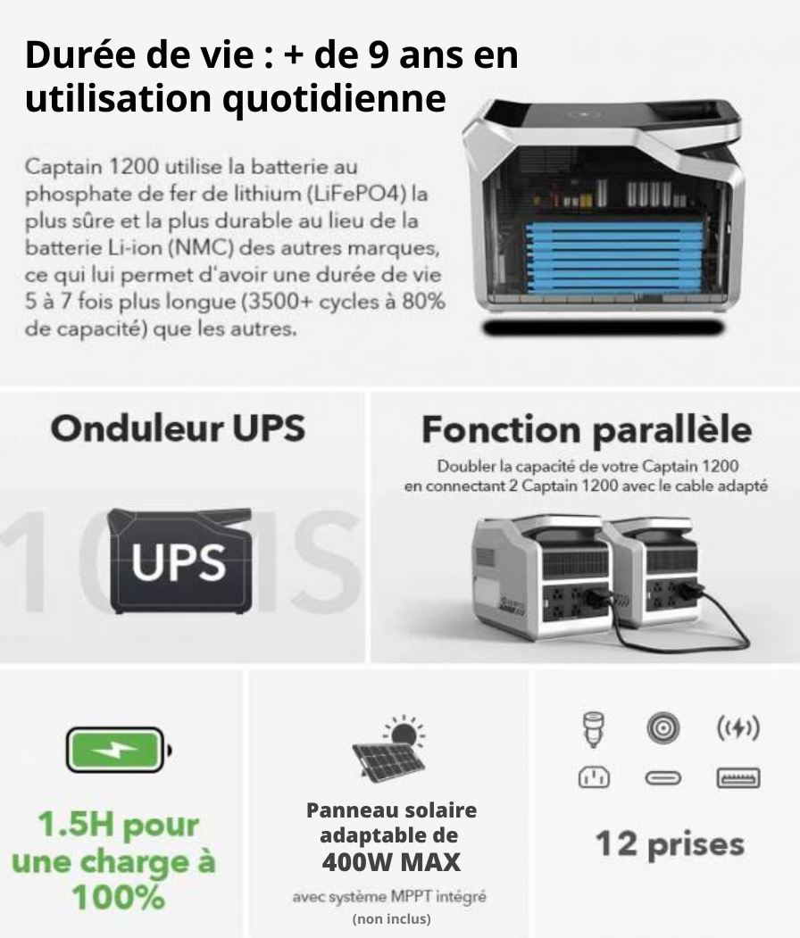 Sa construction solide et résistante en fait un investissement réellement durable qui vous accompagnera pendant de très longues années. En effet, cette station de recharge puissante est composée de 3 couches de protection du BMS : Il s’agit d’une puce intégrée à triple gérances pour réguler et protéger la durée de vie de votre batterie ainsi que celle de votre appareil Captain 1200.