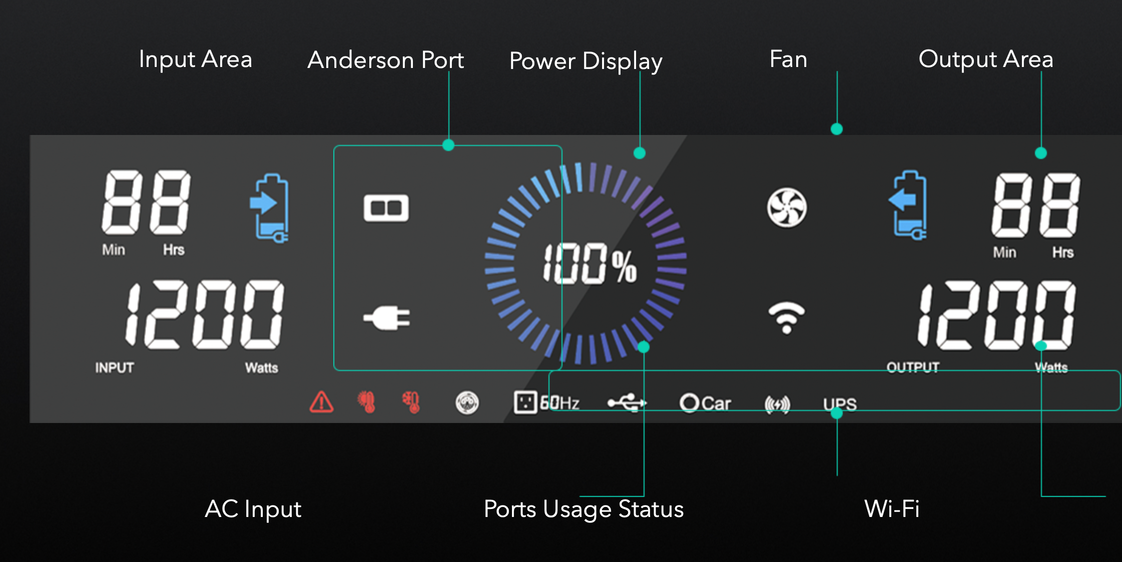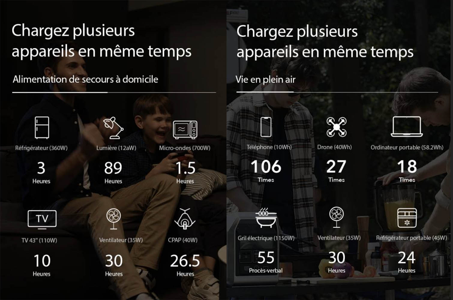 De plus, avec sa fonction UPS, le courant est rétabli pour les appareils connectés dans les 10 millisecondes qui suivent une panne de courant soudaine, ce qui garantit la stabilité et le fonctionnement continu des équipements nécessaires. Avec ses ports USB, ses prises AC et ses adaptateurs intégrés, ce système de recharge innovant peut charger une grande variété d'appareils tels que les smartphones, les tablettes, les ordinateurs portables, télé, lampes, frigo...