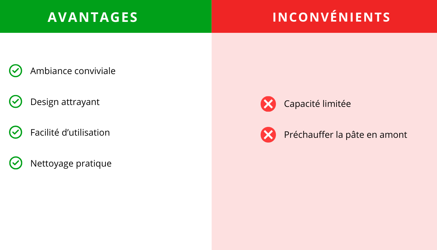 - Cuisson : Laissez l'appareil préchauffer pendant 10 à 15 minutes. Chaque mini-pizza cuit en 5 à 7 minutes, selon l'épaisseur de la pâte et la garniture.