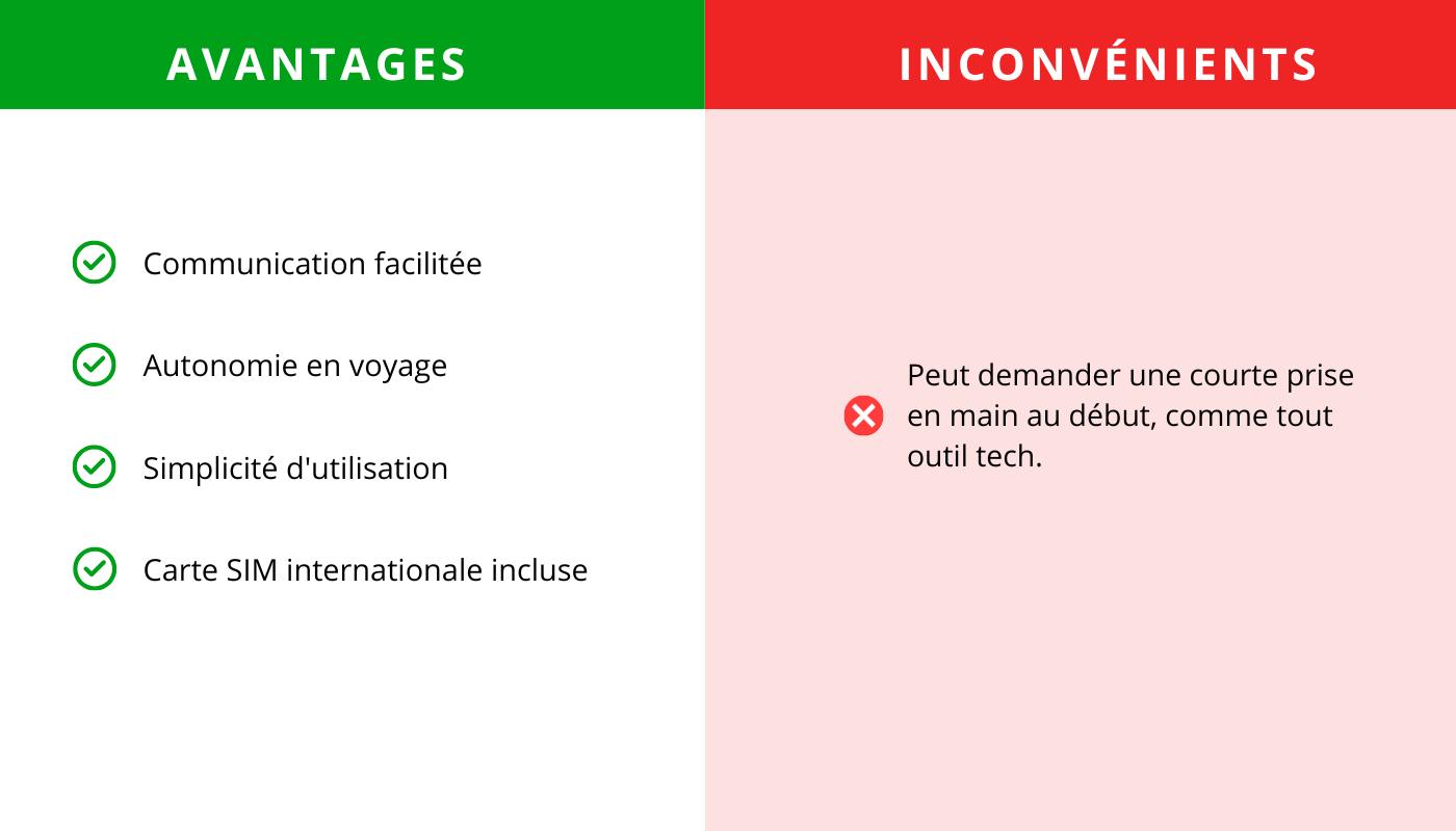 Grâce à sa carte SIM internationale incluse, le Pocketalk fonctionne dans plus de 130 pays (170 pour la version S Plus) même sans Wi-Fi. Une solution idéale pour les aventuriers nomades, baroudeurs ou campeurs.
