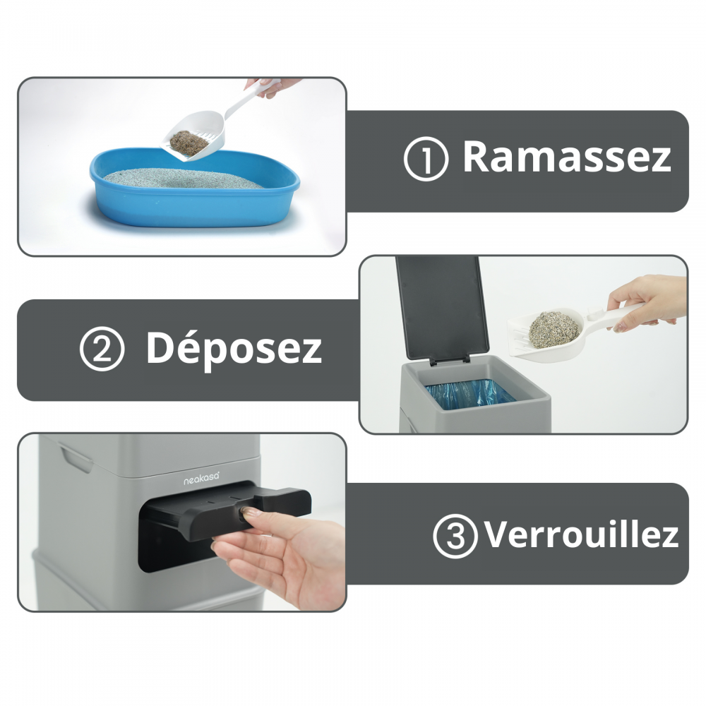 Compatible avec tout type de litière agglomérante, la NEAKASA offre + de 20 jours de tranquillité (= sans changer le sac poubelle) pour 1 chat grâce à une large poubelle de 11.23L