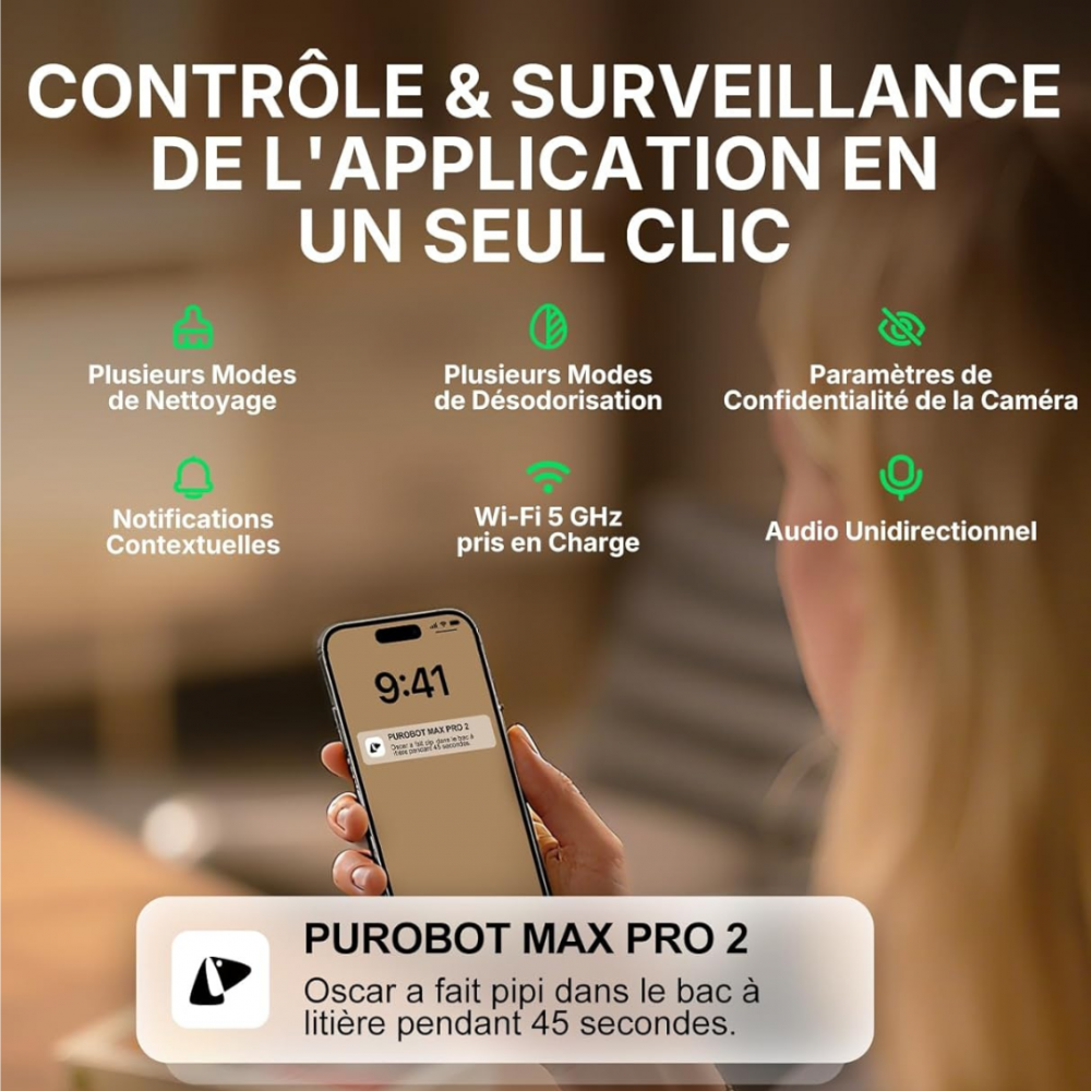 - Lancer un cycle de nettoyage à distance, désodoriser, éteindre/allumer, vider la litière...