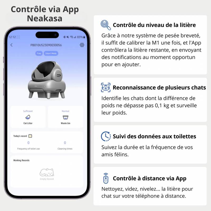 Contrôler à distance la litière Robot NEAKASA n'importe où, n'importe quand. Vous pouvez lancer un cycle de nettoyage à distance et analyser les données (temps d'utilisation, fréquence..)