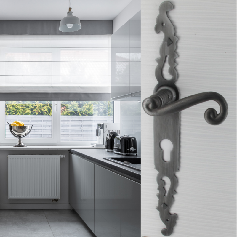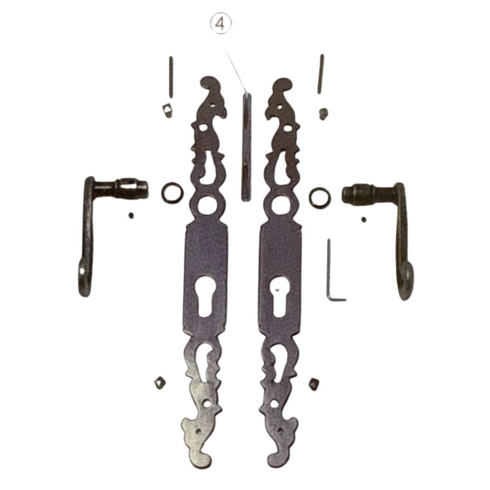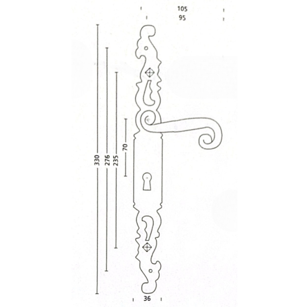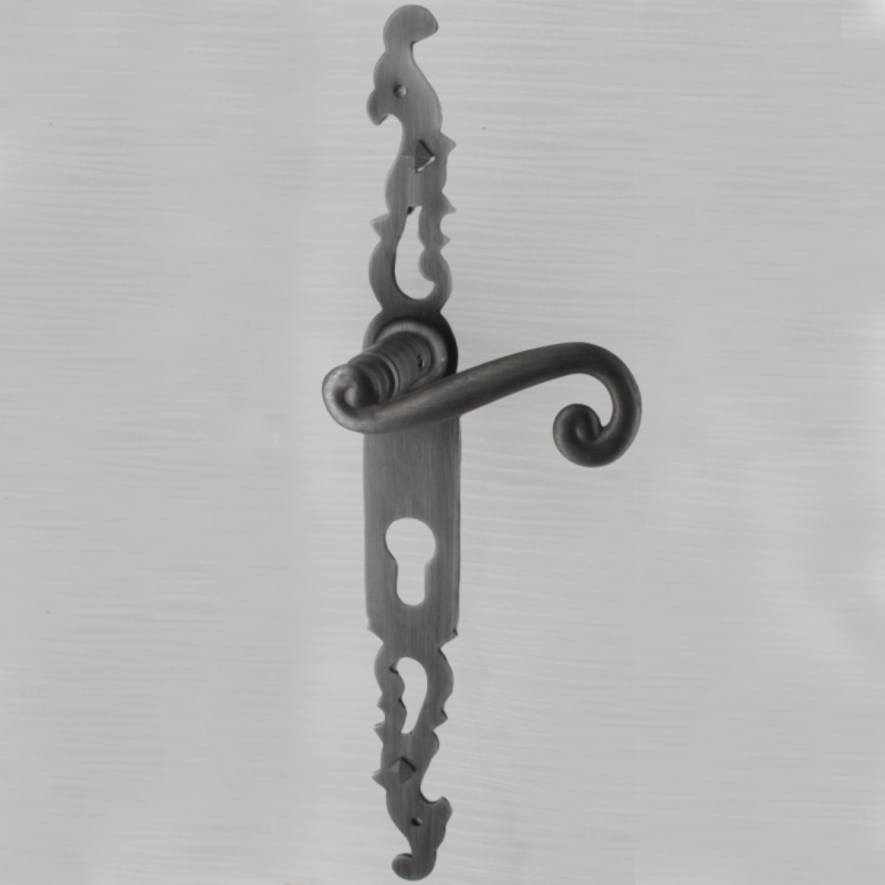 Poignées de porte fer forgé COQ 330x36mm vieil argent à saillie rehaussée