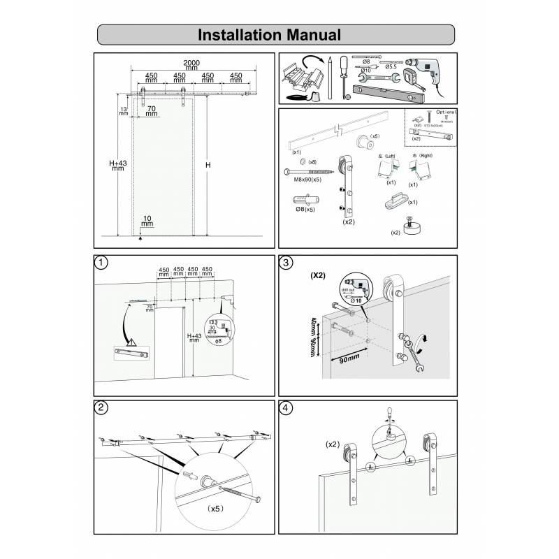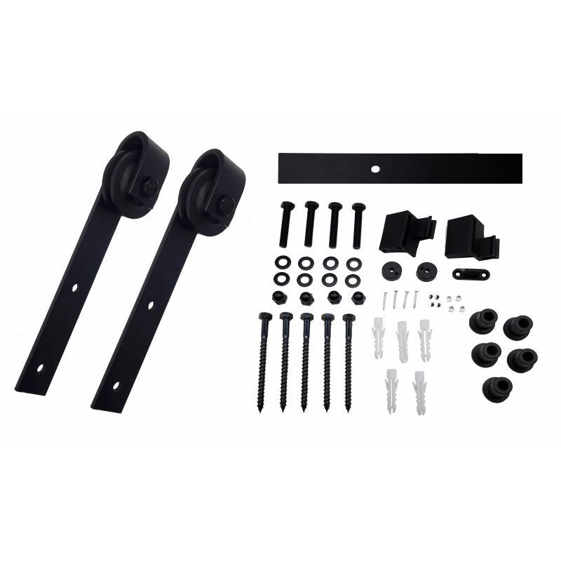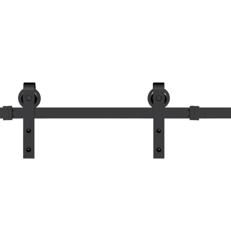 Le kit comprend un rail en acier noir de 2 mètres et deux pentures à galet fixées en applique. Il est livré complet avec tous les accessoires nécessaires pour une installation facile et rapide.