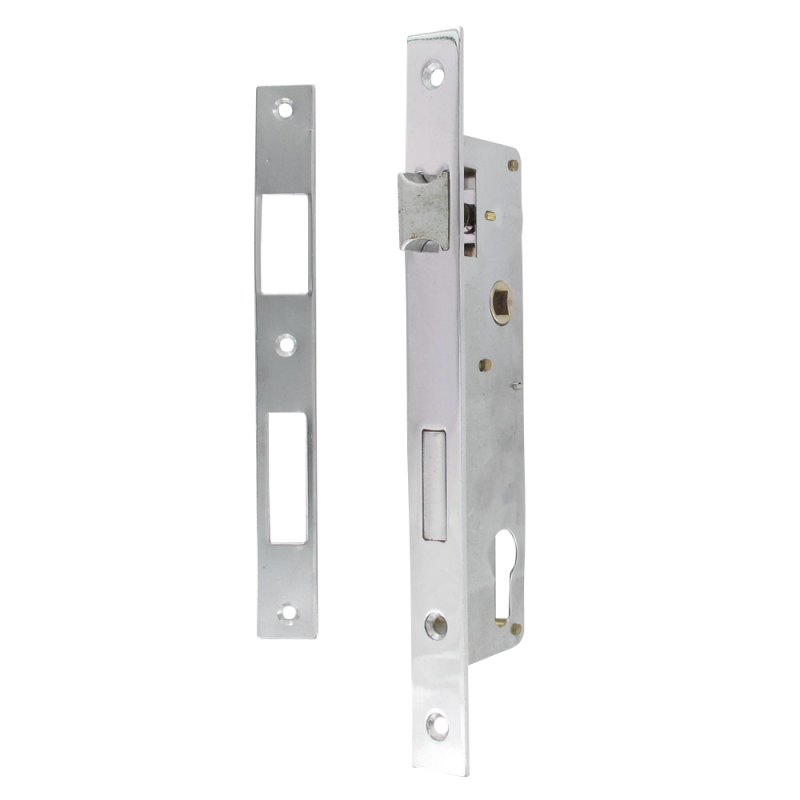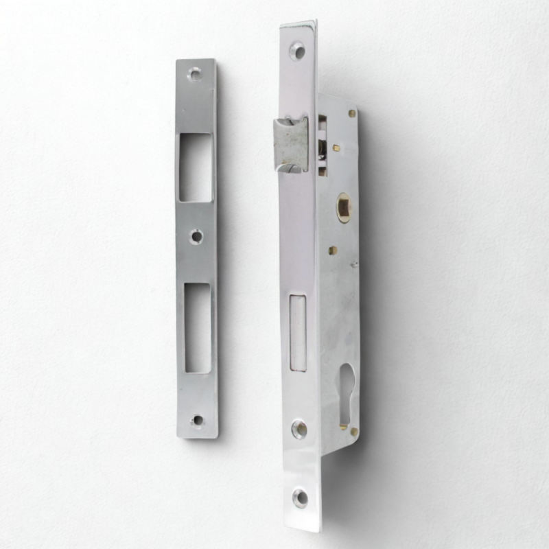 Serrure portail battant - Axe à 30mm - Entraxe 85mm - Chromée + gâche